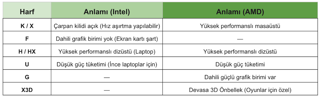 Sayının en sonundaki harfler, işlemcinin "özel yeteneğini" veya "kısıtlamasını" temsil eder: